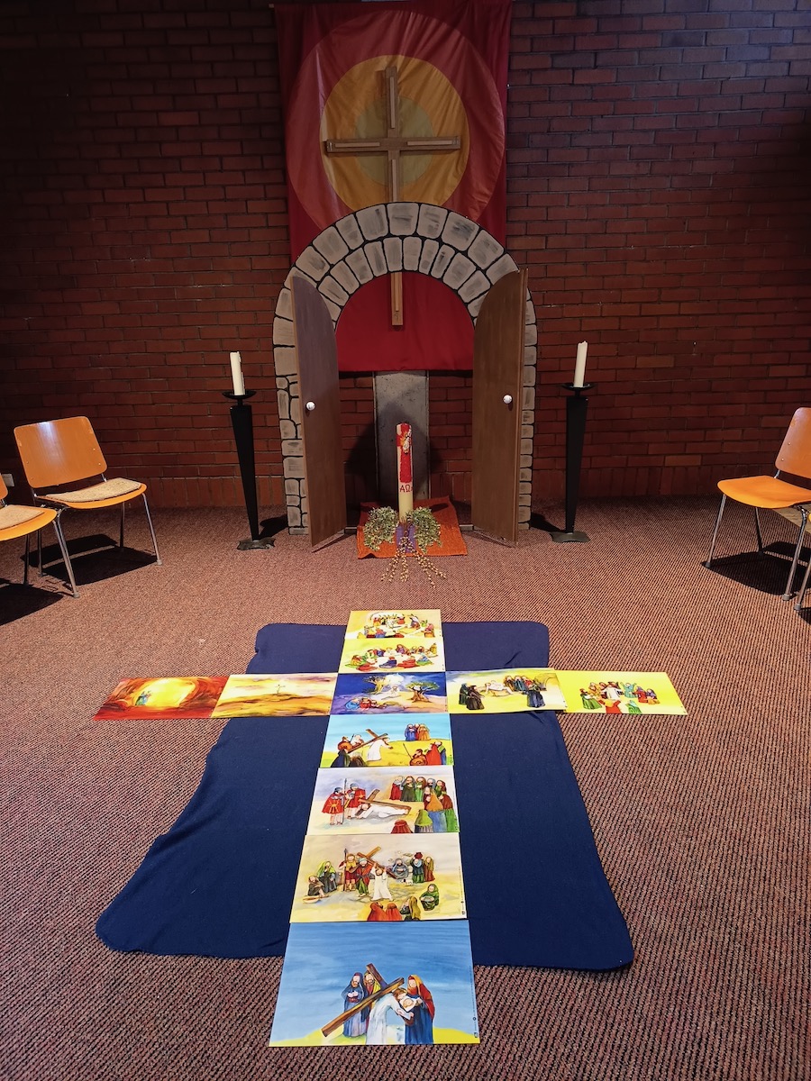 ...und viele sind unserer Einladung gefolgt. Große Kids, kleine Kinder und Begleiter waren gespannt auf unser „Erstes Mal“. Mit zwei sehr guten Vorleserinnen und einer Bildergeschichte legten wir los. „Schritt für Schritt, Tritt für Tritt, geh´n wir, Jesus, deinen Weg nun mit“ war unser gemeinsamer Spruch. Wir folgten Jesus auf seinem beschwerlichen Weg über das letzte Abendmahl, den Ölberg bis hin zur Kreuzigung.