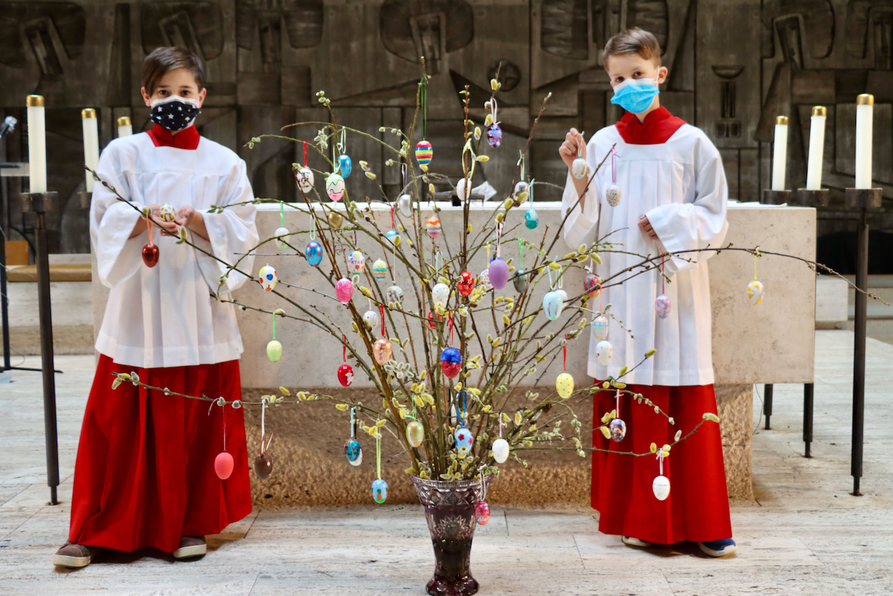 Wenn wir uns schon nicht gemeinsam treffen können, so konnte doch jeder Ministrant ein Ei, dass unsere ehrenamtlichen Helfer euch vorbeigebracht haben, anmalen. Was herausgekommen ist, kann sich sehen lassen. Großes Lob, dass ihr alle mitgemacht habt! Beim Bemalen gab es keine Grenzen. Hinter jedem verzierten Ei steckt eine eigene Idee. Die schön gestalteten Ostereier, viele richtige Kunstwerke, kommen an Zweige in einer Vase beim Altar.