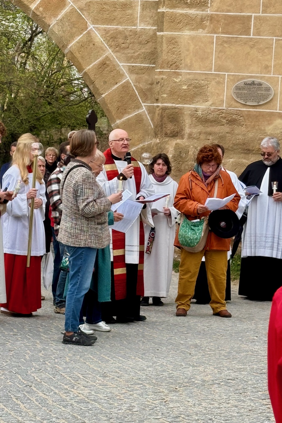 Der Kreuzweg begann am Stadtgraben beim Nabburger Tor mit der Station „Mit meinem Gott überspringe ich Mauern“, gestaltet von der Pfarrei St. Martin. Anschließend führte der Weg zur Stadtbrille, wo unsere Pfarrei die Station „Wasser des Lebens“ gestaltete. Hier stand das lebensspendende Wasser im Mittelpunkt – Symbol für die Freude des Glaubens, das ewige Leben und die Quelle des Heils: Jesus Christus.