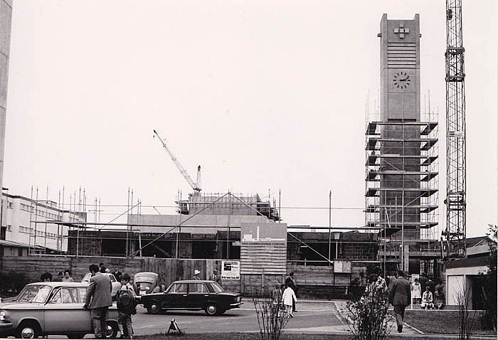 Bilder vom Bau der Kirche, des Pfarrheims und der Kirchenweihe